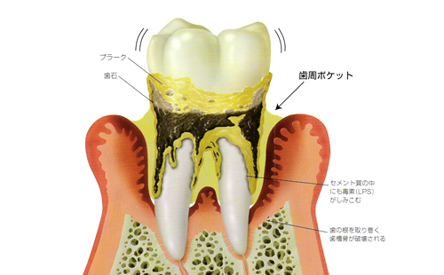 歯を支える歯茎が歯周ポケット内で炎症を起こし、歯槽骨が徐々に吸収してしまう病気です。歯がグラグラして最終的には、抜けてしまう恐ろしい病気です。